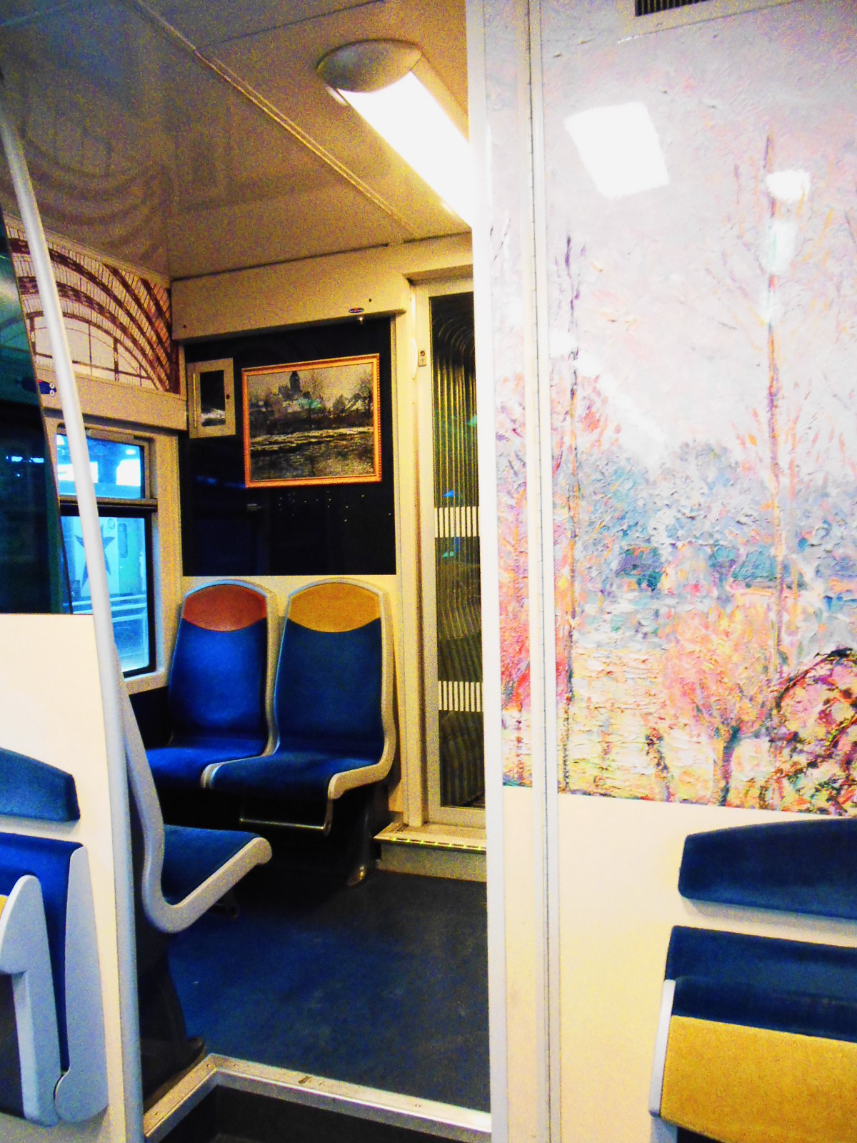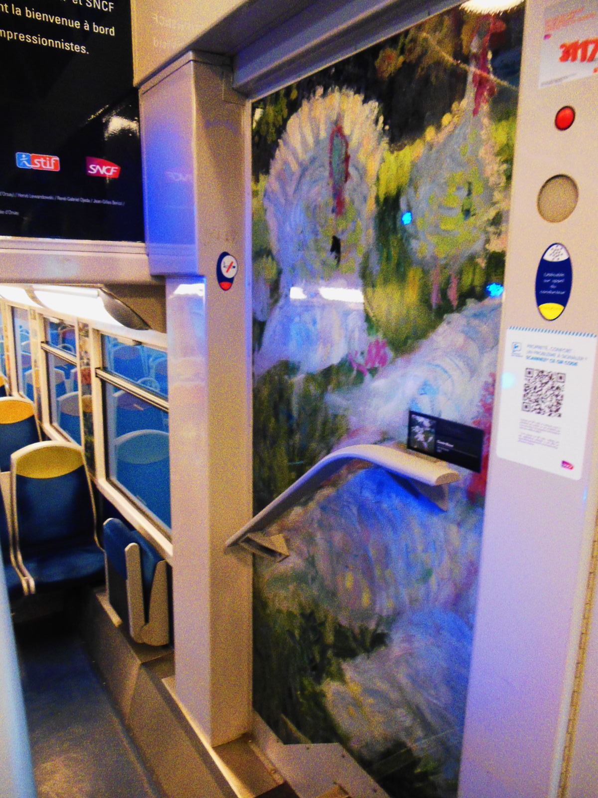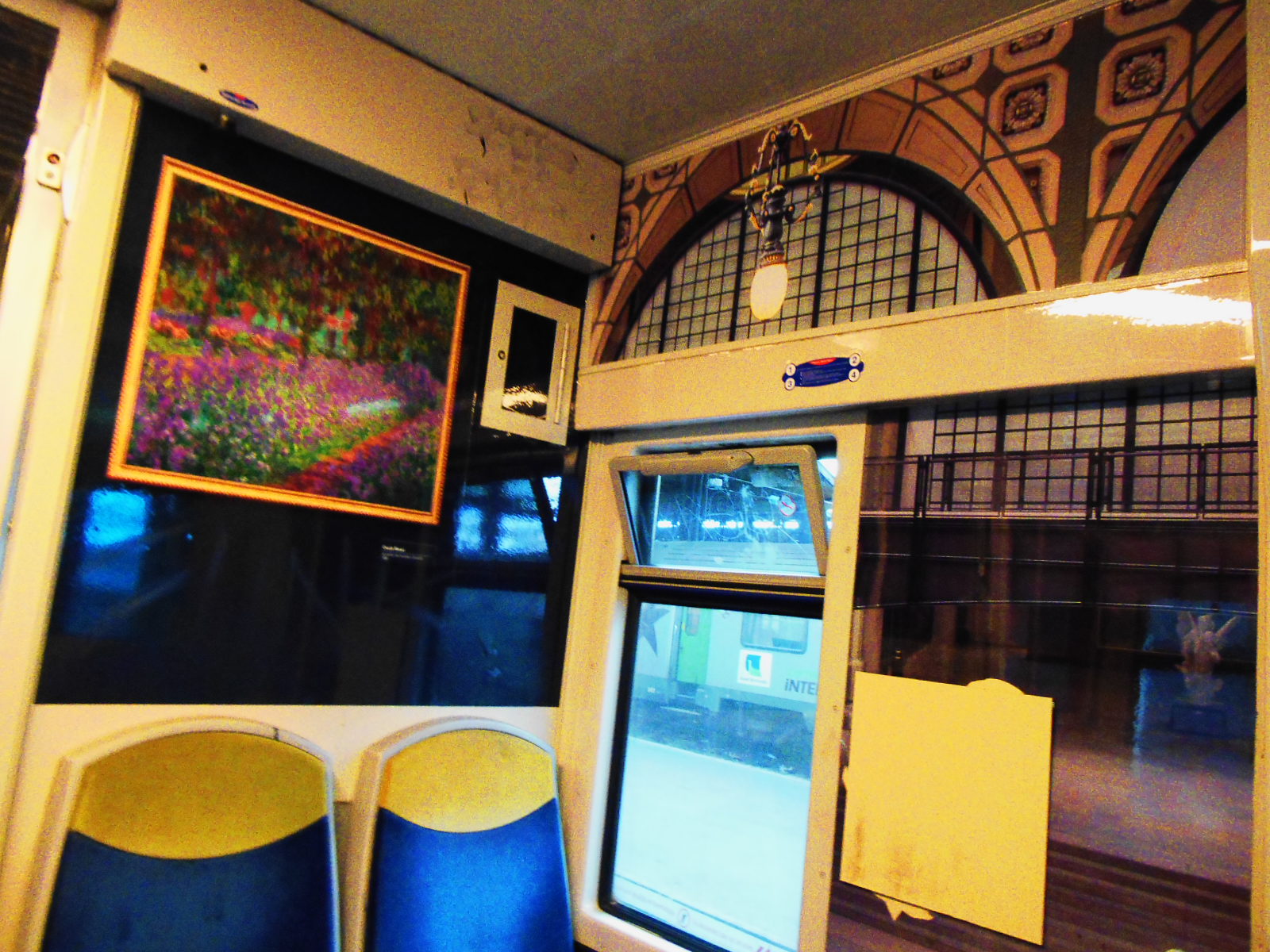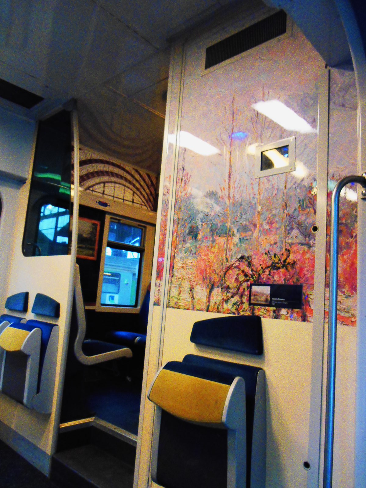 A w pociągu niespodzianka. Podczas, gdy w Saint Denis trwała wielka, niebezpieczna strzelanina, ja podróżowałam do Paryża w otoczeniu piękna impresjonistycznych dzieł sztuki… Kwiaty, kobiety z kolorowymi parasolkami, bujna, piękna, kwitnąca natura pod pędzlami najwybitniejszych malarzy… Cały pociąg – ściany, sufit, przejścia, drzwi ozdobione twórczością Moneta, Pissarra, Renoira…