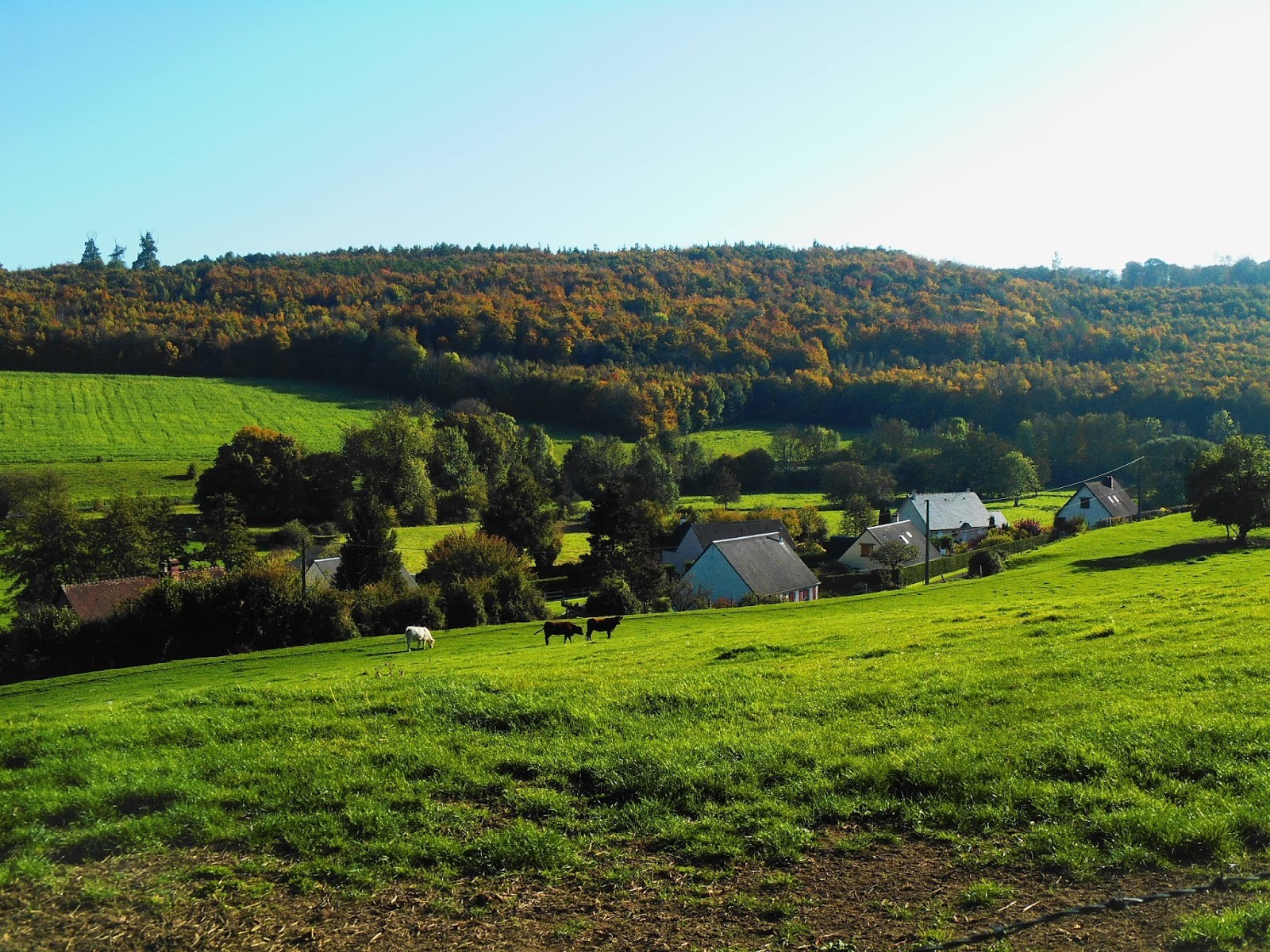Mijając kościół po prawej stronie, ma się wrażenie, że miejscowość tu się kończy, ale warto pójść dalej drogą ciągnącą się do lasu. Dochodzimy do rozstaju dróg, skręcamy w polną ścieżkę, a po lewej stronie rozpościera się przed nami fantastyczny widok. Na wzgórzach wypasają się krowy, w dolinie piękne, już bardziej nowoczesne domy, dookoła bukowe lasy w jesiennych barwach, zieleń i cisza. Przy ścieżce stoi nawet ławeczka, na której można przysiąść i napawać się widokiem i spokojem okolicy.